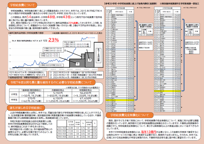 市では、平成10年4月の物価を想定した現行の学校給食費(食材費)について、当時から令和6年4月までに食料品の物価が30.3%上昇するものの、平成27年4月の消費税の変更に伴う改定を除き、他自治体が値上げに踏み切る中でもその費用を据え置いてきました。そのため、県内54自治体のうち、小学校で48位、中学校で43位という学校給食費(食材費)について、現在の学校給食の質と量、提供回数を維持するため、令和7年4月1日以降、やむを得ず下表のとおり改定しました。