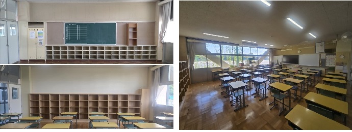[画像]教室ロッカー改修と床改修の様子 東部中学校 左写真は施工前後、右写真は電子黒板設置後です(69.6 KB)小学校の教室のロッカーや床を改修して、使いやすさの向上と転倒を防止する工事を実施しています。