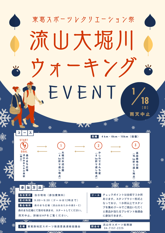 ショートコース(約4km)、ミドルコース(約6km)、ロングコース(約10km)から、自分の体力に合わせてコースを選べるウォーキングイベントを開催します。親子参加も大歓迎、ウォーキングイベントに参加して、みんなで美しい大堀川沿いを散策し健康で活気あふれた1日を過ごしましょう。スタンプラリー形式となっており、1カ所以上でスタンプを集めゴールでご提出いただくと景品が当たるプレゼント抽選会に参加できます。
